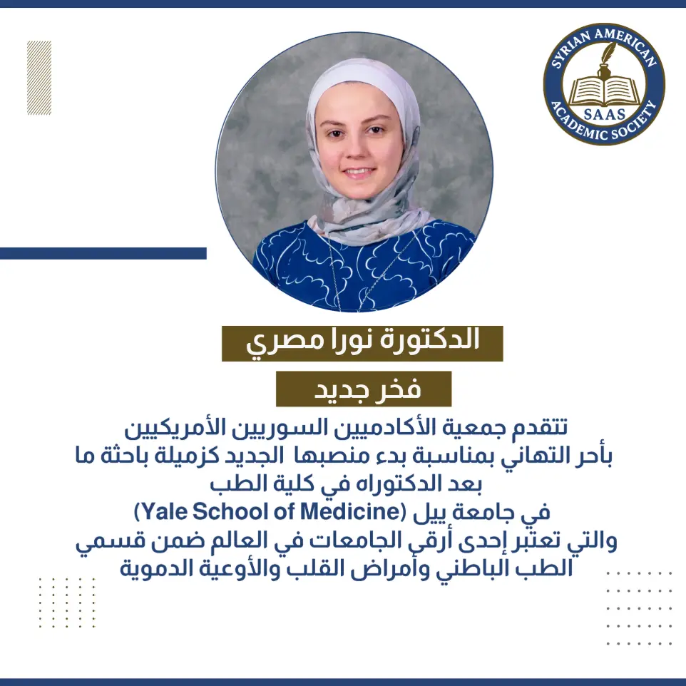 Dr. Nora Masri represents a distinguished model of Syrian academic excellence within leading research and medical institutions and embodies the mission of the Syrian American Academics Association in advancing science, research, and community service.