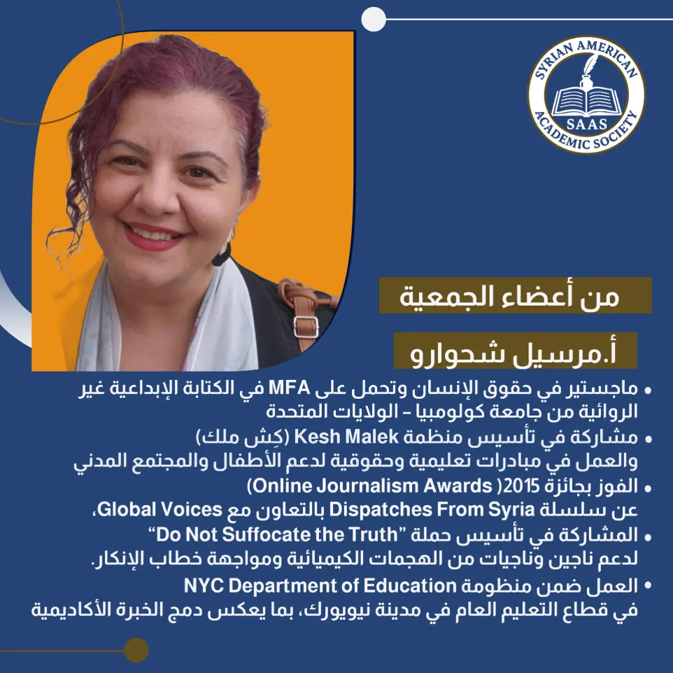 The Syrian American Academics Association welcomes the joining of Marcelle Shehwaro, an active member and a feminist writer.